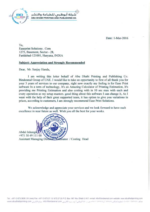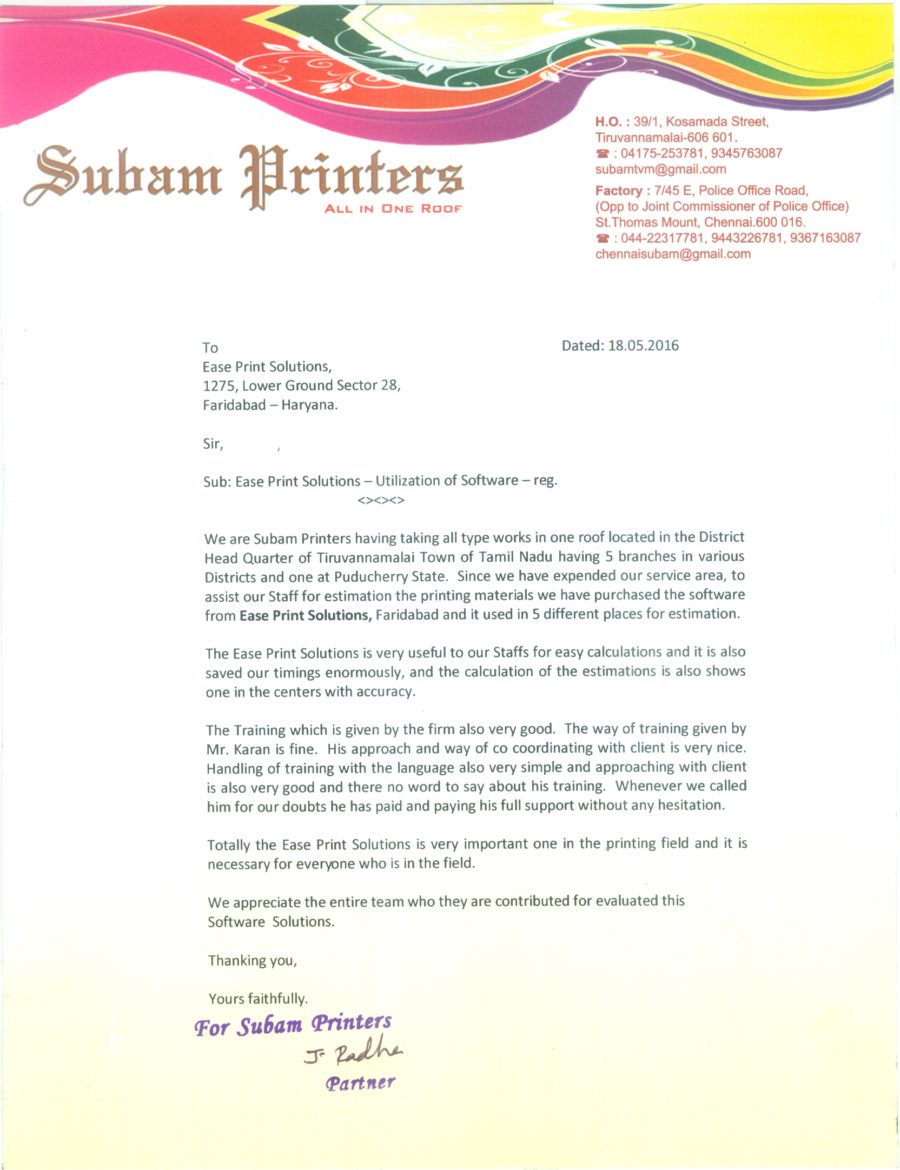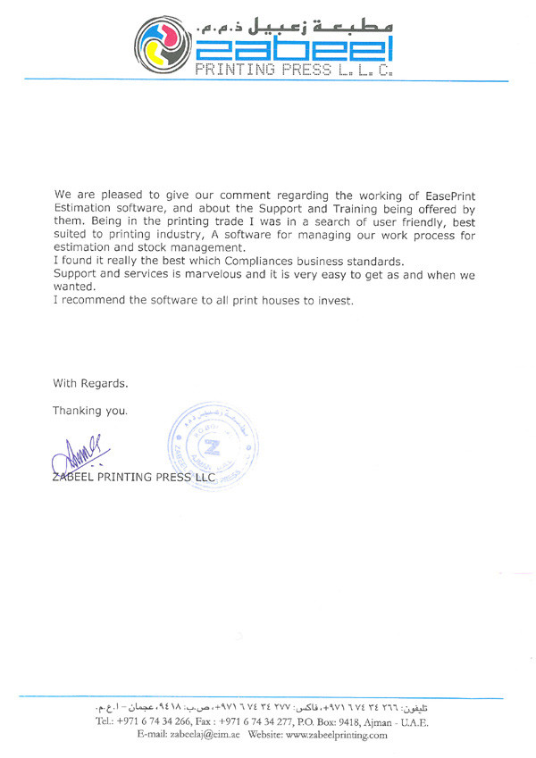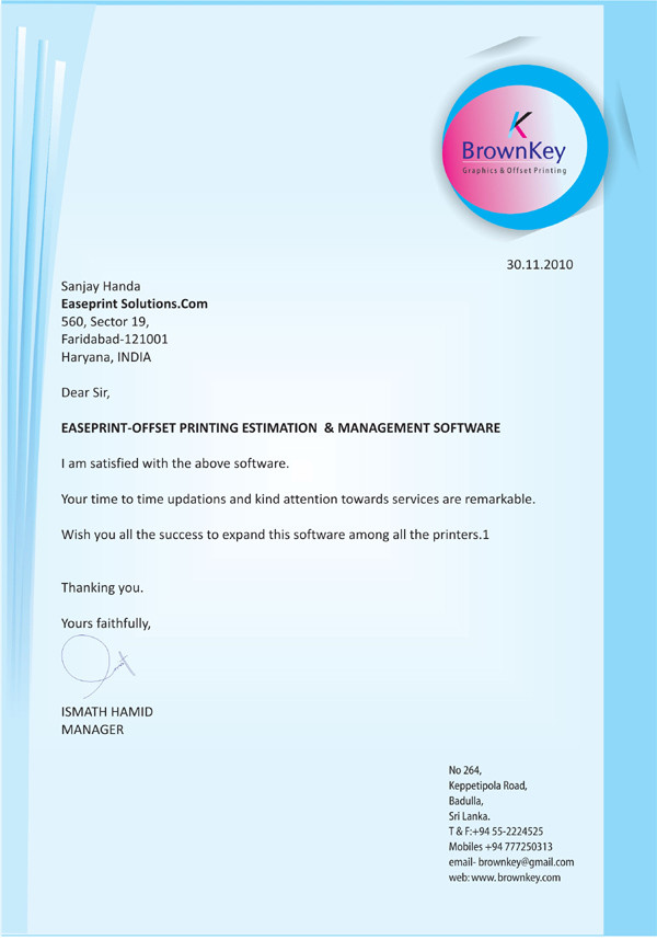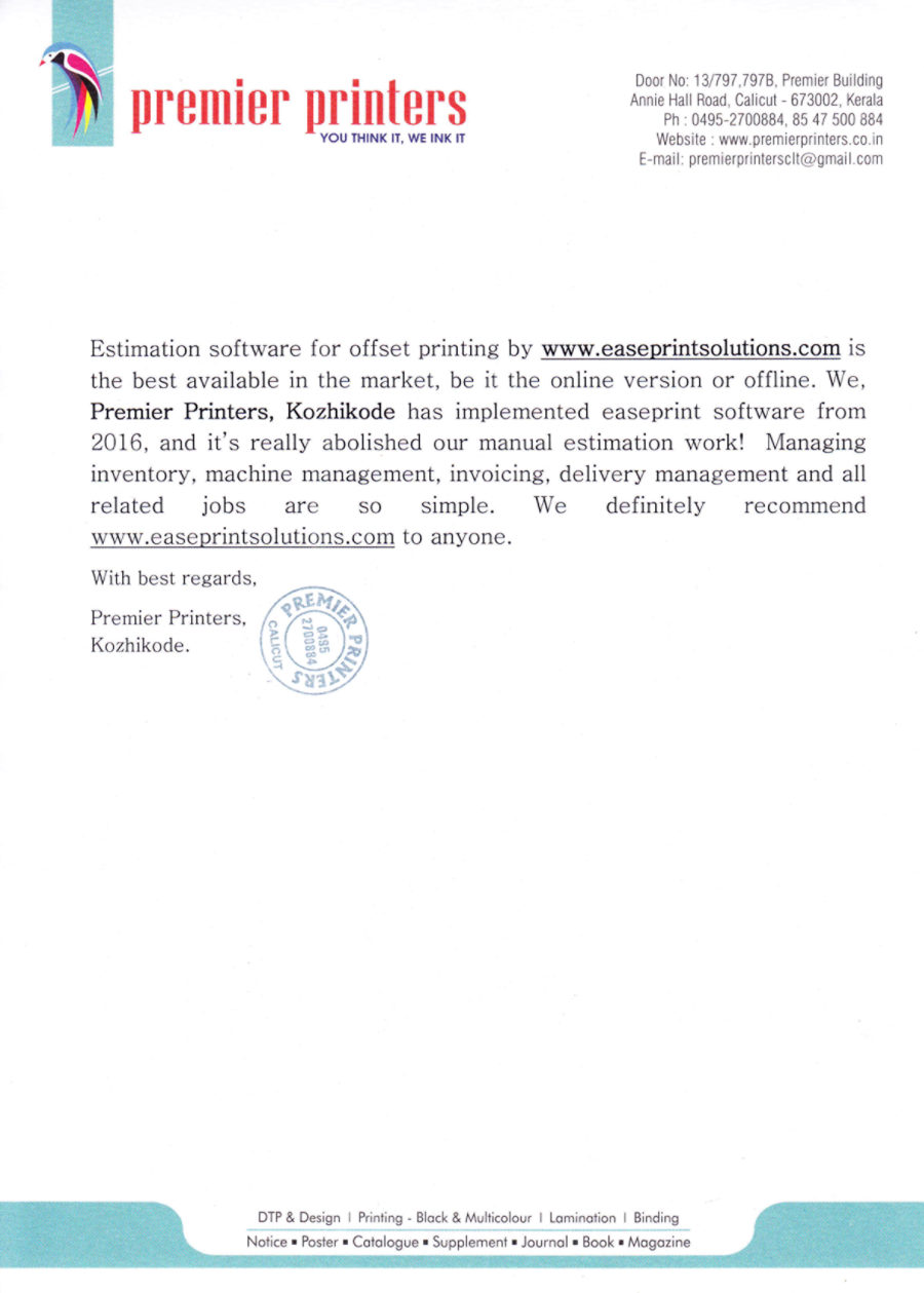 Easeprint provides solutions in the field of Offset Printing, to fulfill the needs for quick Print Management. It is an advance, easier, quicker, and accurate way of generating quotations/Job tickets/Ordering material/print floor /analysis print reports. In short helping and assisting at every level of the printing process from the first step of Estimating till the final stage of the finished product. With more than two decades of experience in the Printing Industry, the developer is well versed in the needs and procedures of the printing process. Have come across the frustration of delay, mistakes, irregularities, losses due to common MANUAL WAY of handling the jobs and working on software developed by an outsider of the trade, the developer then decided to develop Easeprint to get rid of problems like much time involved in estimating manually, internal challenges of training the staff, to achieve the uniform estimates. This tool has been designed for small/medium print houses to guard them against lots of time involvement, paperwork, dependence on staff, checking and maintaining stock reports, for print management by replacing total paper practice. The Easeprint software is very user friendly and can be made operational in minutes once you in feed the database. We believe that Easeprint will be proved the best program to ease away the daily and common but big problems of the printing industry and will do wonders.